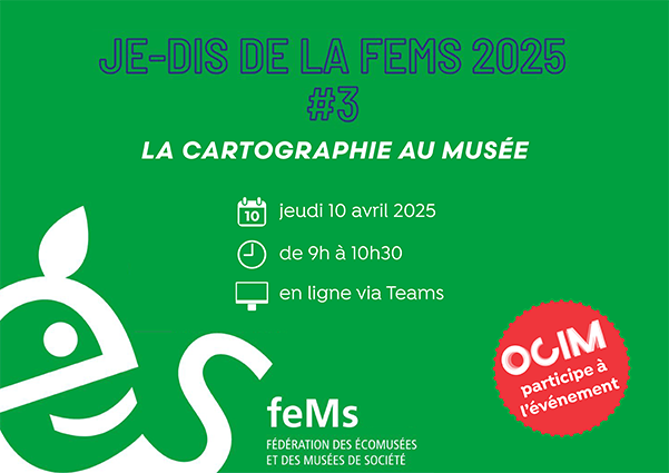 La Fédération des écomusées et des musées de société (Fems) propose depuis 2021 un cycle de rencontres en ligne thématiques : les « JE-DIS de la Fems ». Ces rencontres offrent aux professionnels un moment d’échange thématique autour de leurs expériences professionnelles, de leurs réflexions et des outils qu’ils ont mis en place au sein de leurs institutions. Pour sa troisième édition de 2025, le prochain JE-DIS de la Fems explorera la question de la cartographie au musée.