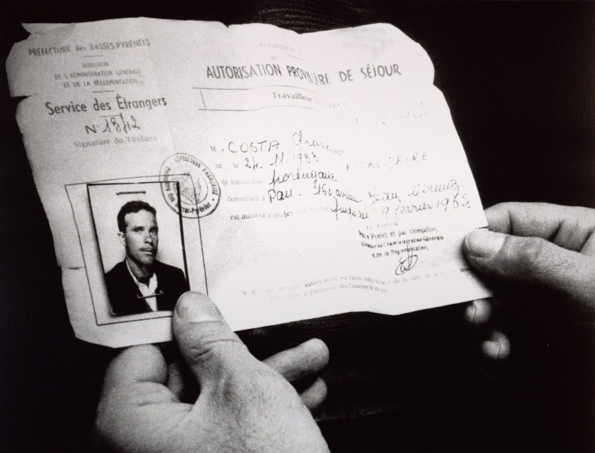 Fig 1 : Autorisation provisoire de séjour attribuée à un travailleur portugais – Tirage photographique de 1964 – Musée national de l’histoire de l’immigration. © Gérald Bloncourt